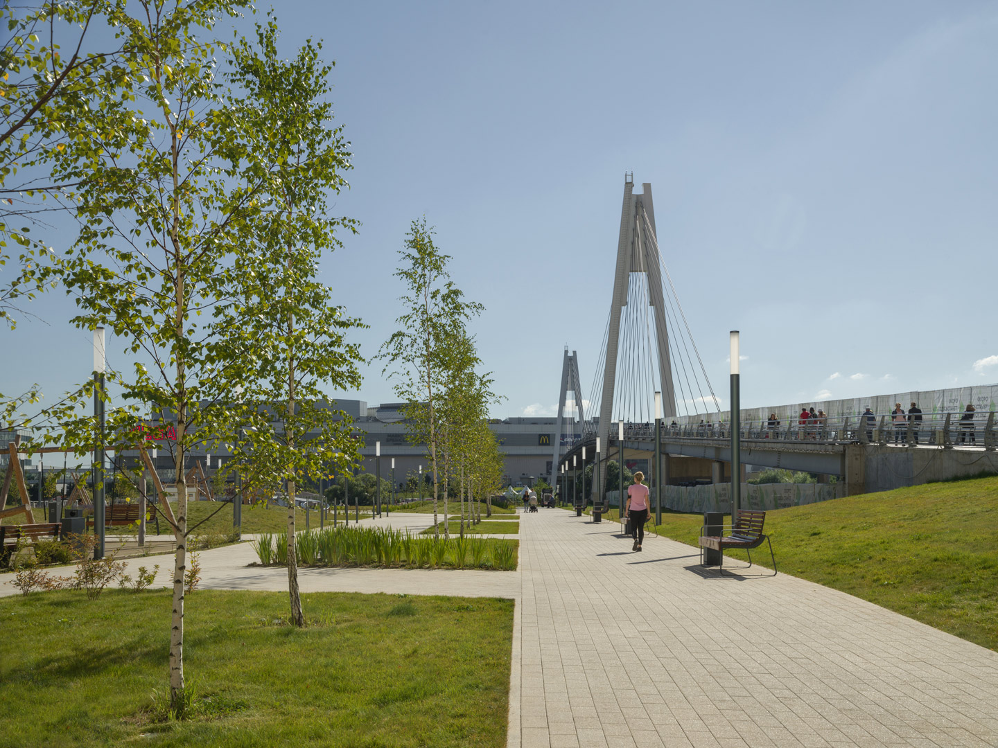 The Pavshinskaya Poyma is a densely populated residential area of Krasnogorsk with a very compact development of high-rise residential buildings which needed recreational areas for comfortable living, walks with children and leisure (the nearest park was not located within walking distance). Basis studio has been working on this project for five years and continues to work on it. The entire project for the improvement of Pavshinskaya Poyma covers about 13 hectares. The first stage, completed in autumn 2020, constituted 4 hectares; now another large part of the lower embankment is completed.